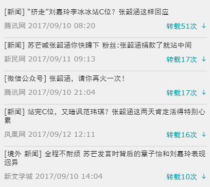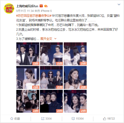 鹰击舆情显示,2017年9月11日11时34分,微博用户@上海吃喝玩乐fun 所发布的有关“张韶涵抢站C位”的事件被转发次数最多,达到3304次,评论15364条。