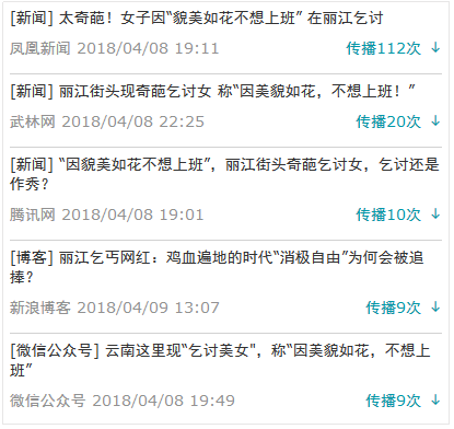 4月8日9:26,@春城晚报 发布微博“‘因美貌如花,不想上班’丽江街头现奇葩乞讨女!”首先爆料此事。直至18时,经@紫荆树 @网络新闻联播 @云南共青团 转发报道后,事件热度开始逐渐上升。