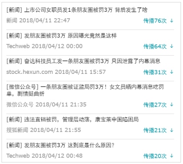 新浪新闻、Techweb、和讯网等对“发朋友圈被罚3万”进行了报道,并都有了几十次的传播量。新闻报道较为客观,主要说明事件的缘由。