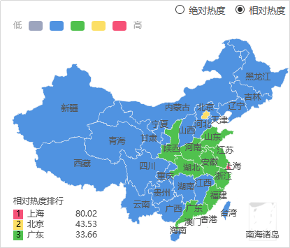 从地域分布上看,该事件的热度值排行(按相对热度)以上海居首,其次是北京、广东。