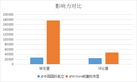 这两条博文都具备一定程度的影响力,转发量、评论里均不容小觑,但对比来看,陈伟霆的博文影响力要远高于中国国际航空。