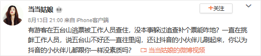 8月13日21时,新浪微博网友@当当姑娘 发博首先爆料“游客拍视频称遭五台山景区工作人员拦截限制人身自由”一事,因其普通博主的身份,并未引起网友关注;