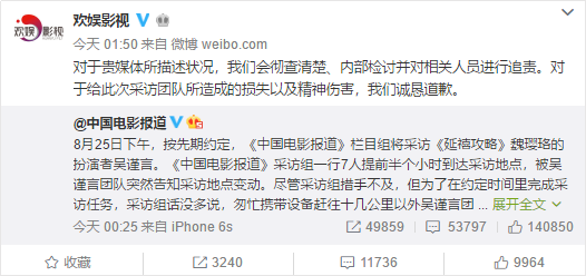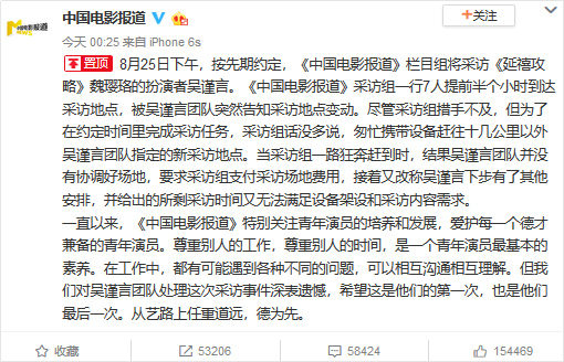 《中国电影报道》节目组原定当天下午采访《延禧攻略》女主角魏璎珞的扮演者吴谨言。采访前半个小时,节目组赶到了与吴谨言团队约定的采访地点,却被临时通知,要换到十几公里以外的新的采访地点,随后又被要求付场地费。