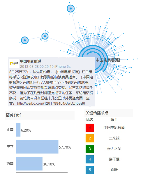 博文发出后,#中国电影报道控诉吴谨言团队#登上微博热搜榜,引发网友热议。截至11时许,转评赞已超过20万。@二米派 @来去之间 @饼干姐 @霜叶 等博主成为关键传播节点。对于该博文内容,正面和中立情绪占比63.9%;负面占36.1%。