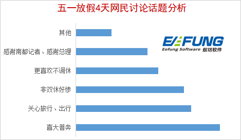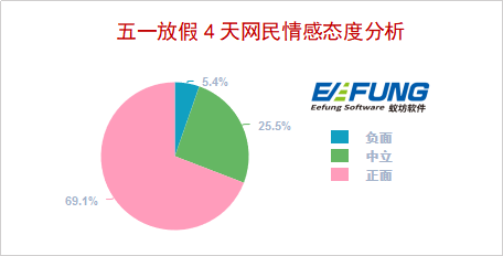 对于“劳动节放假”这个关系到每个人切身利益的热点话题,网民展现了热切的关注。舆情监测系统鹰眼速读网显示,持正面态度的网民占比69.1%;中立态度占比25.5%;负面仅为5.4%。