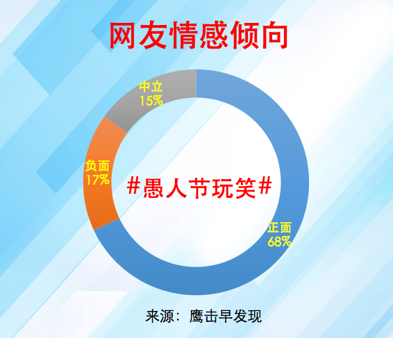从舆情监测软件的情感分析来看,对于愚人节玩笑,大部分的网友持正面态度,68%的人认为:这个节日真正的功能是表白啊!用玩笑的方式,说出最真的土味情话,表白失败就当是“愚人节”,表白成功呢?当然是过“育人节”;开个玩笑也不错;可以光明正大的骗人了。17%的网友持负面态度,认为很难把控开玩笑的尺度,有些玩笑开的比较过分。