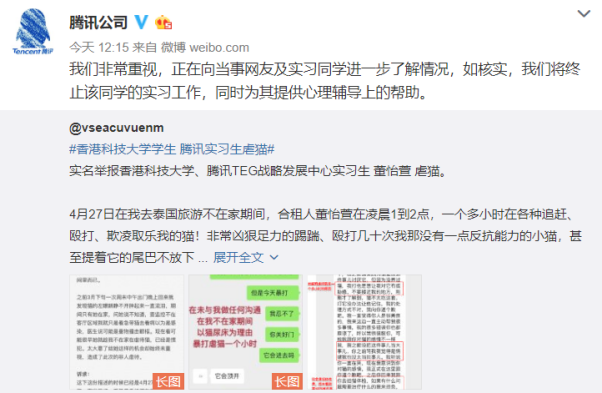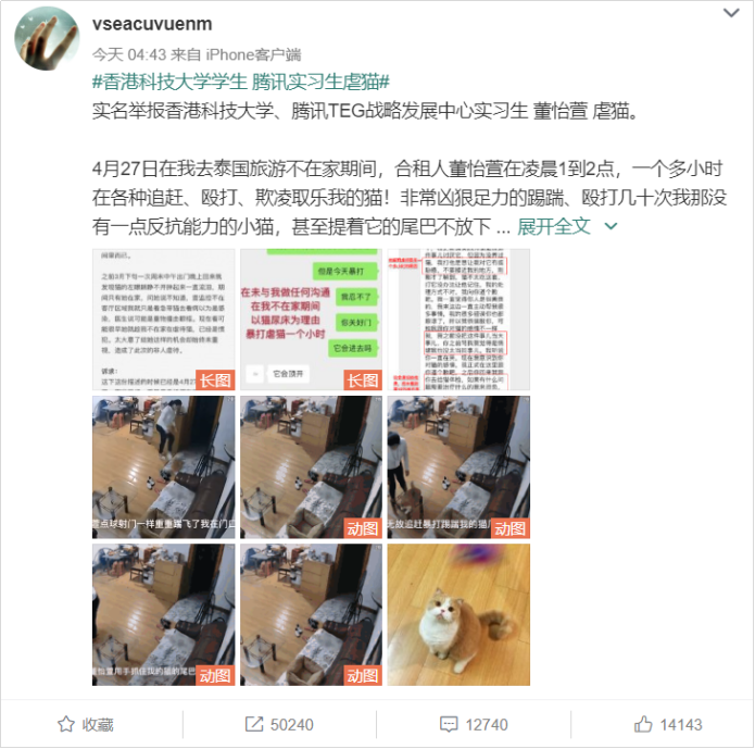 4月30日04:43,网友@vseacuvuenm 发博,称“香港科技大学学生 腾讯实习生虐猫”。博文一经发出,引起网友关注和讨论。截至30日14:00,该条博文转发量达5万多。