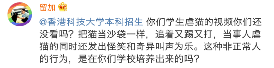 此前被爆出多起虐待小动物的事件,并造成较大影响,但往往会经过1-2天的发酵再爆发。本次事件从爆出到形成热点,仅几个小时,除了触及“虐待小动物”这个敏感话题外,“香港科技大学学生 腾讯实习生”的身份标签也极大提升了公众对事件的兴趣。