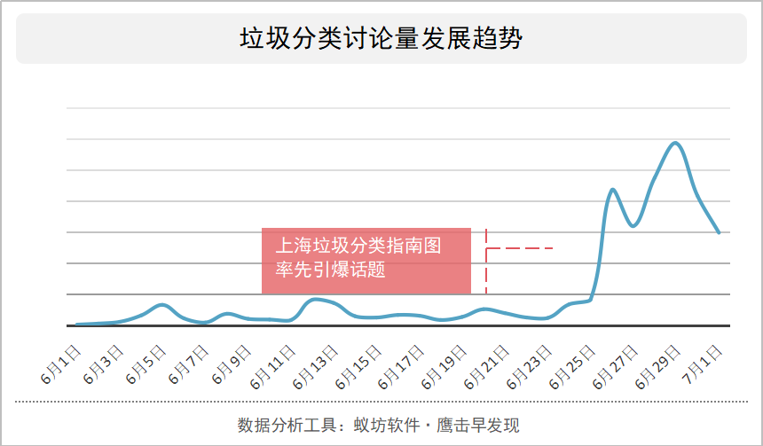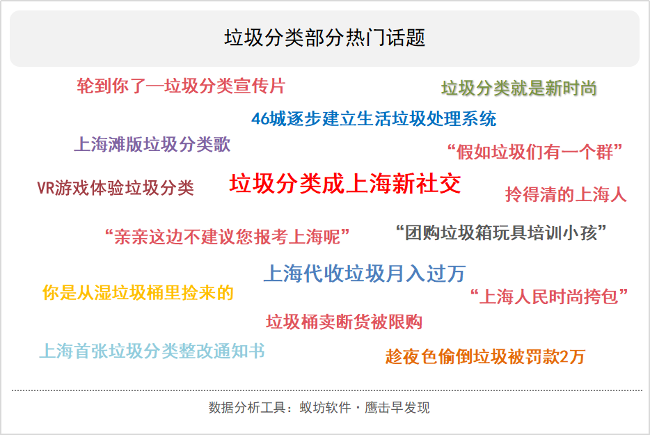 自6月份以来,关于垃圾分类的讨论层出不穷,而真正掀起热度高峰则来源于网络上一组上海垃圾分类指南图,干垃圾、湿垃圾、有害垃圾和可回收物共四个类别下面,分别列出了25-26种具体的垃圾物品。排列组合之后,网民大呼“分不清!”随后,关于干湿垃圾、同情上海市民、垃圾分类歌等话题应运而生,上海垃圾分类知识普及已经纳入学业水平考试,话题热度居高不下。