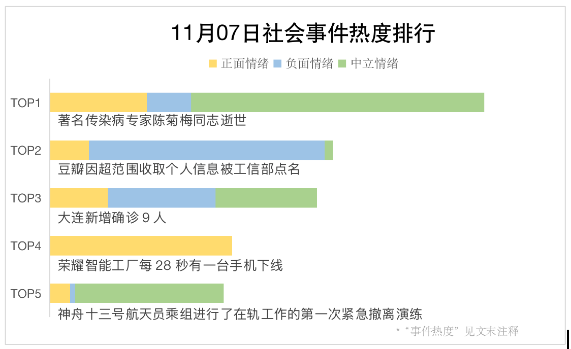 11月07日热度最高的5个社会事件如上图所示,当日社会情绪指数为正面三级。