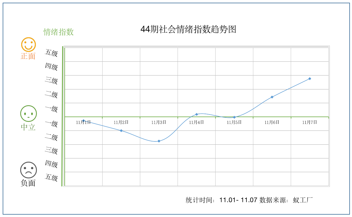 第44期社会情绪指数趋势图如上所示:上周社会情绪波动范围较大,11月07日达到正面三级,为上周峰值;11月03日达到负面二级,为上周谷值。