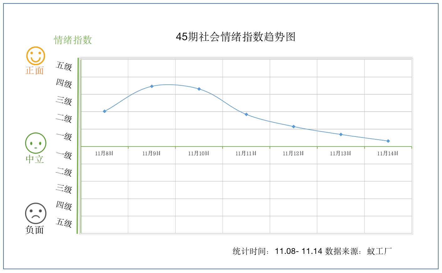 第45期社会情绪指数趋势图如上所示:上周社会情绪波动较为平稳以正面情绪为主,11月09日达到正面四级,为上周峰值。
