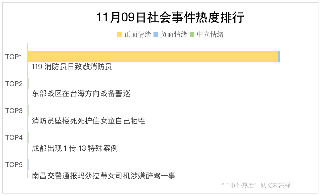 11月09日热度最高的5个社会事件如上图所示,当日社会情绪指数为正面四级。
