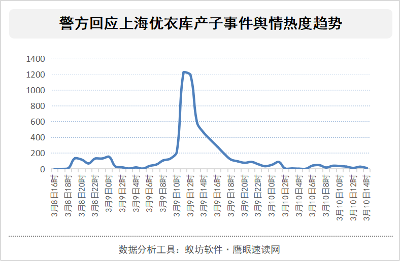 纵观该事件的舆情发酵过程,媒体报道之初即传递出了“网传上海一女子在优衣库试衣间产子”、“上海警方回应网传女子商场试衣间产子”的消息,该事件开始进入舆论视野,舆情随即呈现小幅上升;3月9日,在网民质疑声音的推波助澜下,于13时到达峰值;由于事件无最新消息出现,紧接着舆情热度逐渐回落。从网民舆论质疑点来看,首先该女子个人情况信息缺失,包括家人亲友、本人的精神状态等;再者,众多网民认为产妇一人完成家中生子不可能,进而质疑是不是本人所生。
