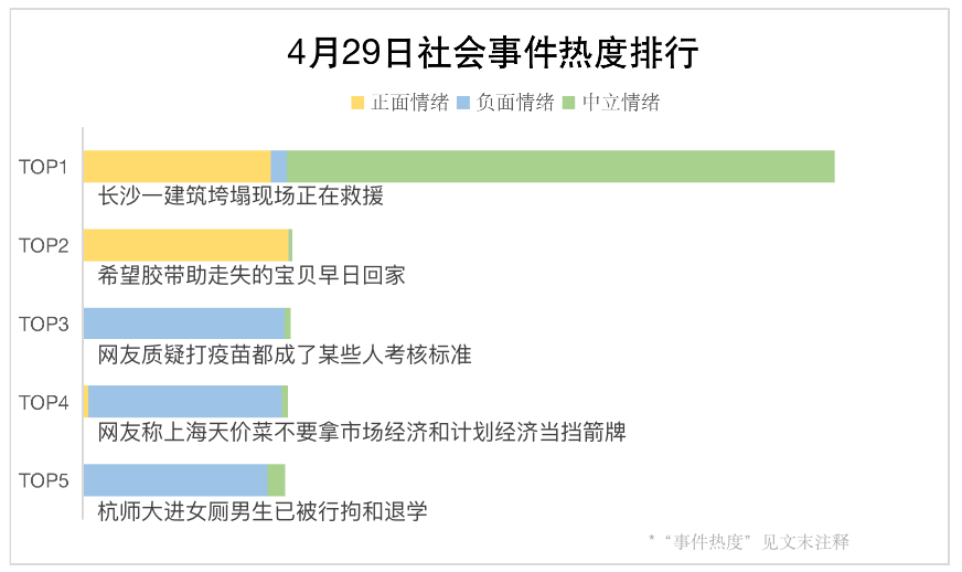 4月29日热度最高的5个社会事件如上图所示,当日社会情绪指数为正面一级。