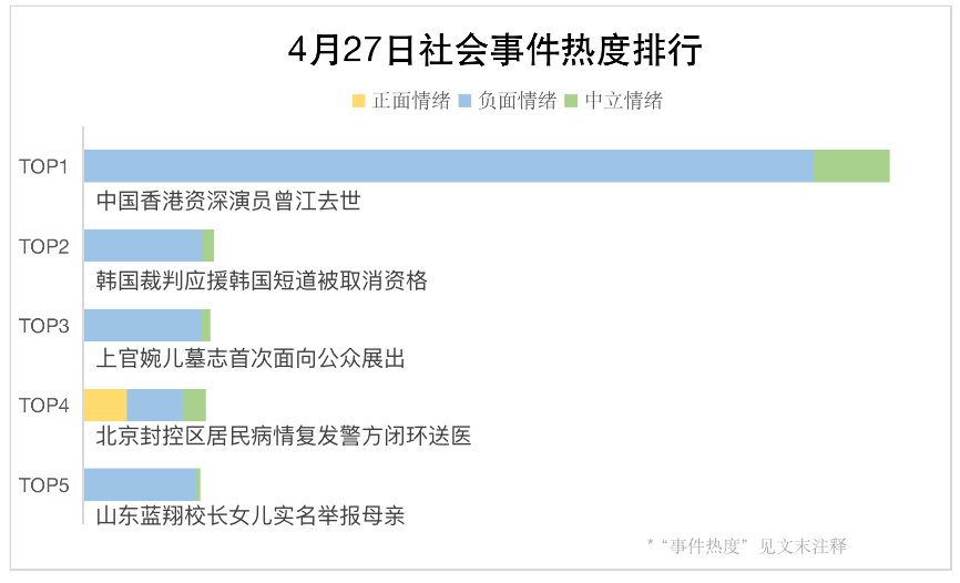 4月27日热度最高的5个社会事件如上图所示,多数事件都以负面情绪为主,大量的负面情绪事件将当日社会情绪指数推至负面二级。