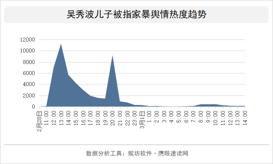 2月28日上午11:33,该事件中的女当事人@iris_43kg 在社交平台上发长文控诉自己跟吴秀波儿子吴翰交往期间被家暴多次,该事件一经爆料,便引来了众多自媒体大V们的转发扩散,“吴秀波儿子 家暴”的热搜词条迅速生成,网络舆情热度被迅速引爆,达到热度峰值,随后出现逐渐回落的趋势。2月28日晚间,更多的娱乐类自媒体大V们介入此事的传播,在以吴秀波儿子被指家暴为主要传播内容的基础上,吴秀波此前的劣迹往事以及吴秀波曾经称自己的大儿子和自己一模一样的言论也成为他们传播的重要内容,使得该事件的传播热度再次攀升,形成第二个热度峰值。3月1日,有关于当地妇联的回应信息受到了一定的关注,当地妇联称目前还未接到此事相关求助,但是该消息的关注度很快消散。