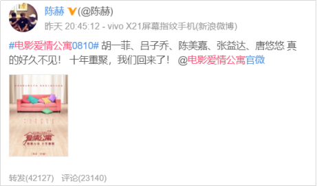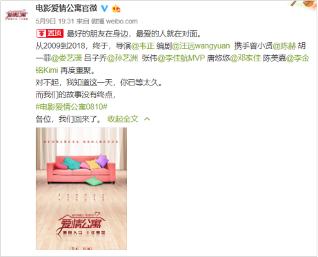 2018年5月9日,@电影爱情公寓官微 发博宣布《爱情公寓》电影版定档8月10日,赴十年之约。爱粉们表示,终于死等到了......