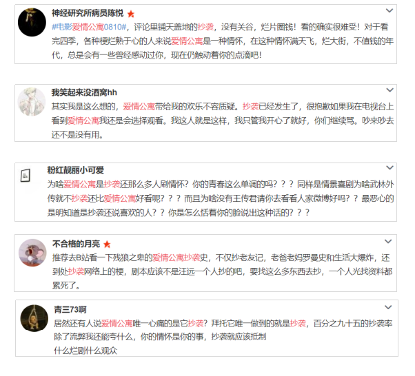 在《爱情公寓》电视剧播出期间,就屡次被批抄袭《老友记》和《老爸老妈浪漫史》等剧。电影定档,关于抄袭的的议论也再次出现。有爱粉为《爱情公寓》的抄袭行为感到难过,但依然选择支持。也有网友质问,为什么一部抄袭剧可以刷情怀,为什么抄袭剧还有人喜欢看。