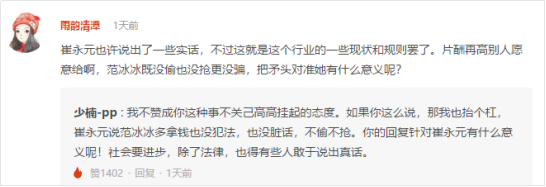 此外,@每日经济新闻 @新浪新闻等媒体博主均作了相关报道,促进了事件的进一步传播。@湖南律师刘成成则从法律视角发表看法:阴阳合同的事,其实是指向刑事犯罪中的偷税罪;范冰冰工作室其实是指责崔永元涉嫌诽谤罪以及侵犯商业秘密罪。
