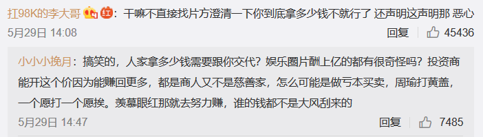 从重点博主看,@娱乐八掌柜 @扒圈酱 @娱圈星探 @圈内老铁等娱乐圈知名博主表现最为活跃。@娱八婆:本来还挺喜欢崔永元的,觉得他很有正义感。但最近崔永元和《手机2》剧组的恩怨越闹越大,还把范冰冰的合同曝光了,这就有点low了吧。编剧、导演、家属撕了个遍,现在又拿演员博话题,口口声声说抵制网络暴力的崔老师,自己又在做什么呢?截至5月30日16时,该博文评论数达6000余条,点赞数近2万。