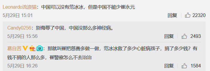 ①5月24日,崔永元将8年前范冰冰获得了某企业组织颁发的“国家精神造就者奖”一事发博,称“一个真敢发,一个真敢领”,嘲笑之意不言自喻。