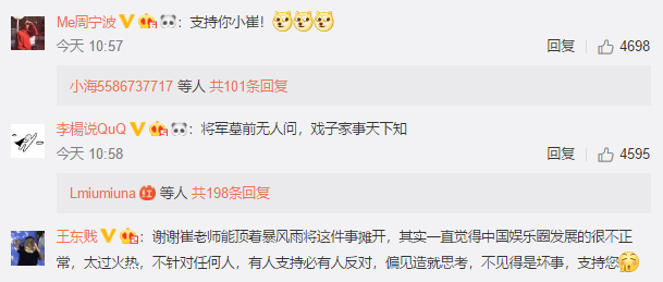 该博文评论热度TOP3如上图所示,“支持你小崔”、“将军墓前无人问,戏子家事天下知”均获赞4000+。