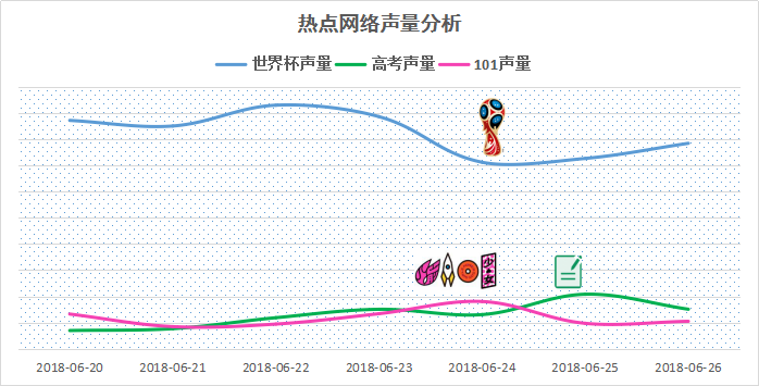 通过鹰眼速读网对三大热点近一周的网络声量进行分析,世界杯的网络声量最大,热度远高于高考和101;高考和101声量基本齐驱并骤,高考稍显优势;6月23日,创造101女孩成团,“火箭少女101”出道,6月24日声量有所上升;6月24日,高考成绩公布,6月25日声量随之抬高。