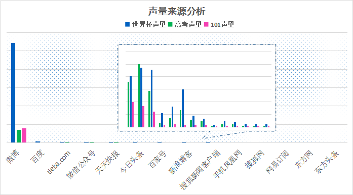 就鹰眼速读网“声量来源分析”来看,微博是主要的声量来源,其他平台与其相比几乎不是一个数量级;百度、贴吧、微信公众号、天天快报、今日头条、百家号等也带来了部分声量。