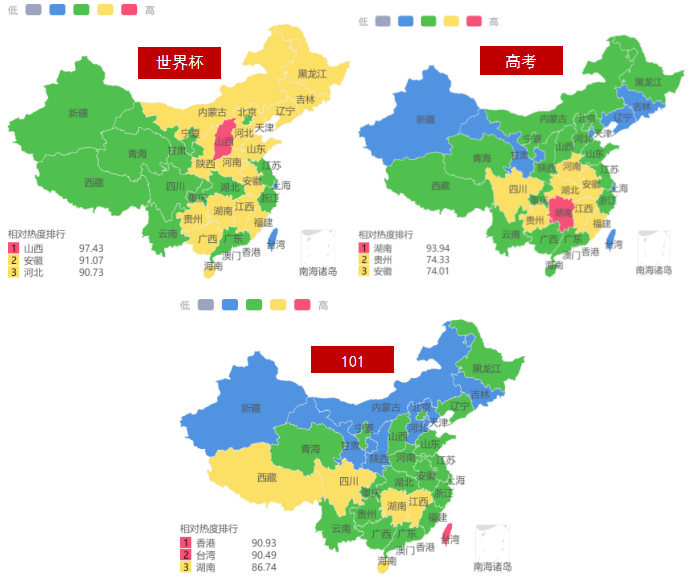 山西、安徽、河北的网友关注世界杯,湖南、贵州、安徽的网友关注高考,香港、台湾、湖南的网友关注101。