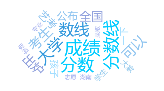 对于热点“高考”,“成绩”、“分数线”、“艺考”、“大学”是主要高频词。