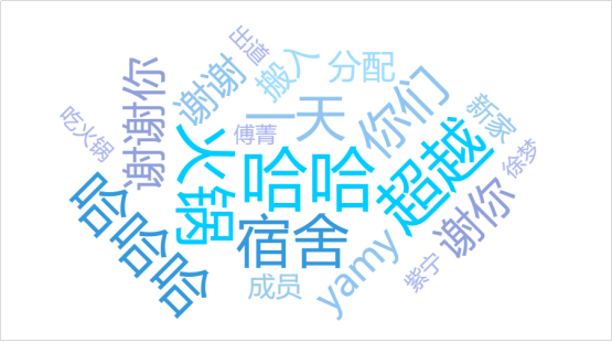 鹰击早发现对火箭少女101进行热词分析,“哈哈”、“超越”、“火锅”、“宿舍”是高频词。
