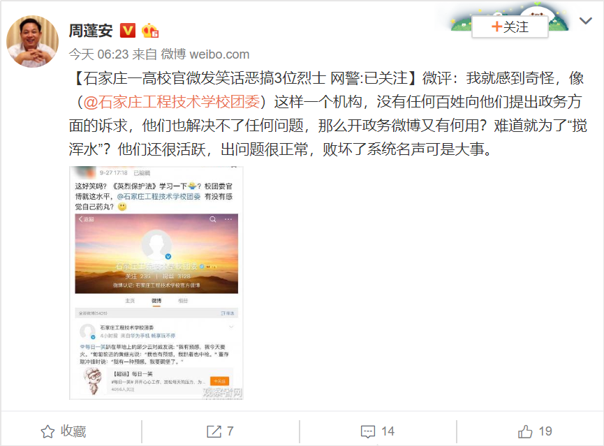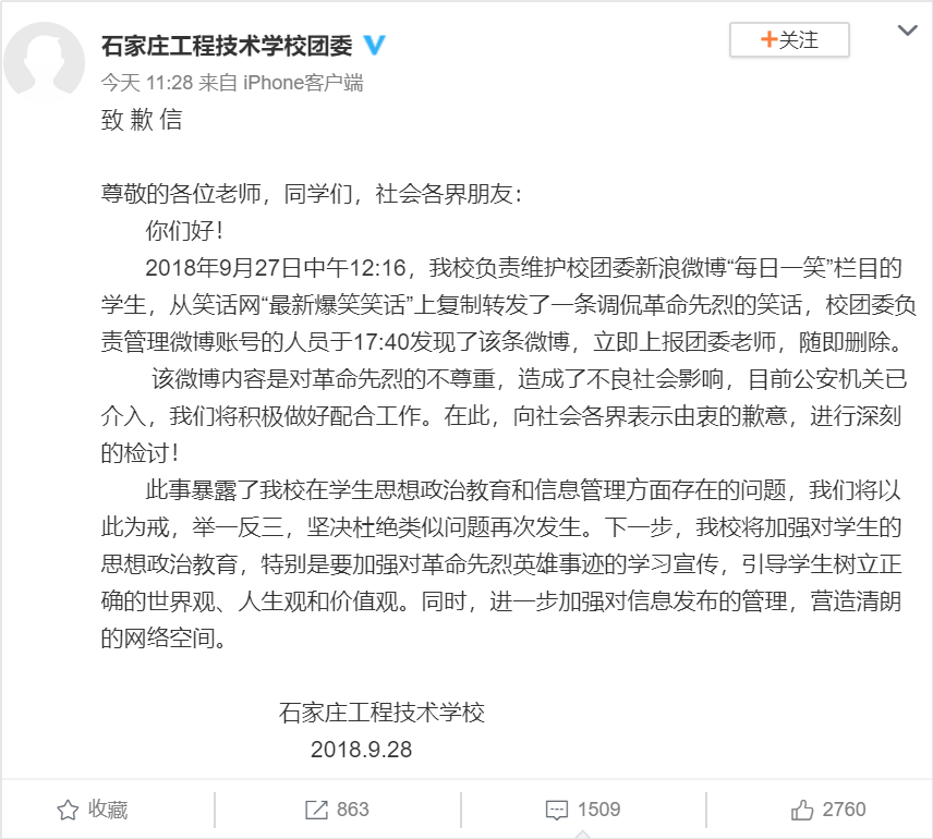 9月28日11:28,石家庄工程技术学校通过官方微博发布了致歉信:我校负责维护校团委新浪微博“每日一笑”栏目的学生,从笑话网“最新爆笑笑话”上复制转发了一条调侃革命先烈的笑话,校团委负责管理微博账号的人员于17:40发现了该条微博,立即上报团委老师,随即删除。