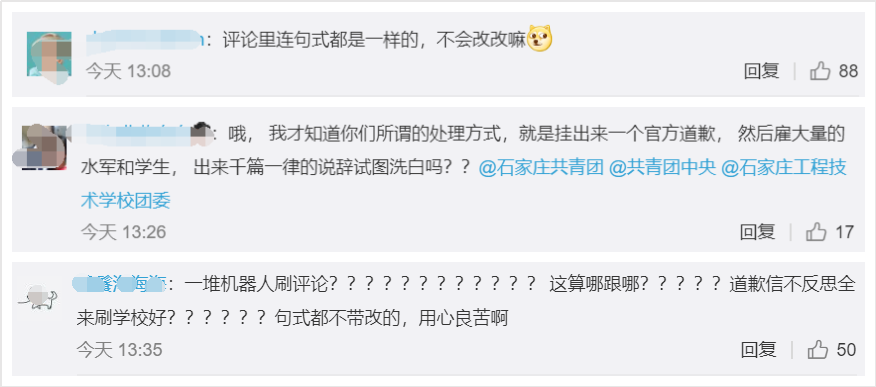 不过,该致歉博文下方的评论因似曾相识的格式被网友质疑“这底下的学生评论都是什么鬼?买的水军?就算是学生自发为学校说话,也别全都复制粘帖吧……”。
