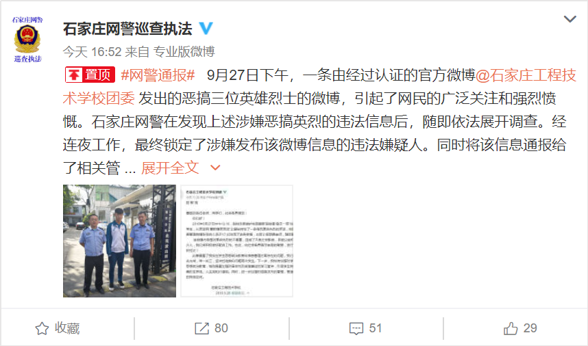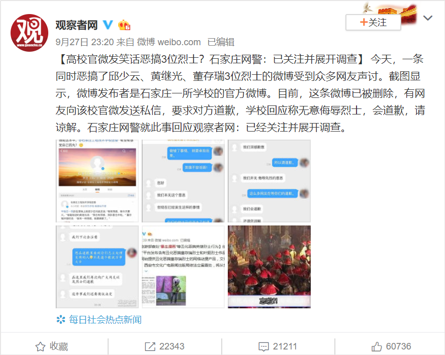 9月27日下午,石家庄工程技术学校的官方微博“石家庄工程技术团委”发布了一则调侃、恶搞邱少云、黄继光、董存瑞3位烈士的消息。此消息在发布时带有“每日一笑”超话,很快受到众多网友关注和声讨。目前,石家庄网警回应表示,已经关注并展开调查。