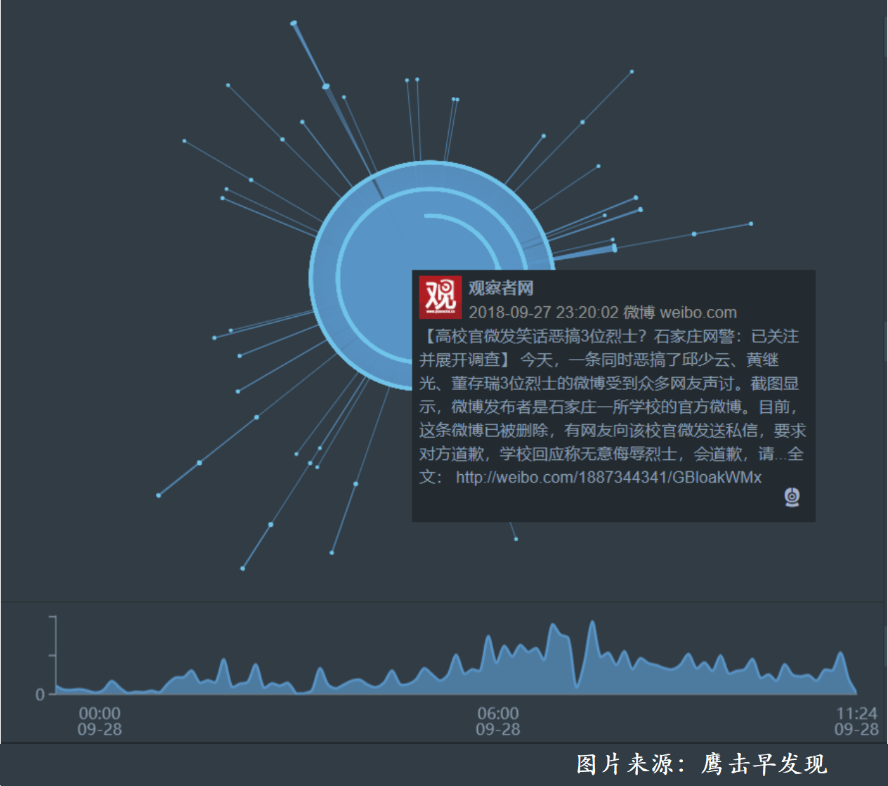 蚁坊软件舆情检测系统显示,@观察者网 于9月27日23:20所发布的“高校官微发笑话恶搞3位烈士?石家庄网警:已关注并展开调查”博文影响力较大,获转评赞10万+次,是“高校官微发笑话恶搞烈士”相关热门微博之一。