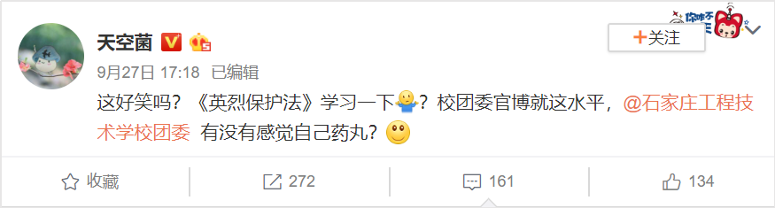 27日下午17时许,军事博主手动@石家庄工程技术学校团委 并愤怒地问道:“这好笑吗?《英烈保护法》学习一下?校团委官博就这水平,有没有感觉自己药丸?”