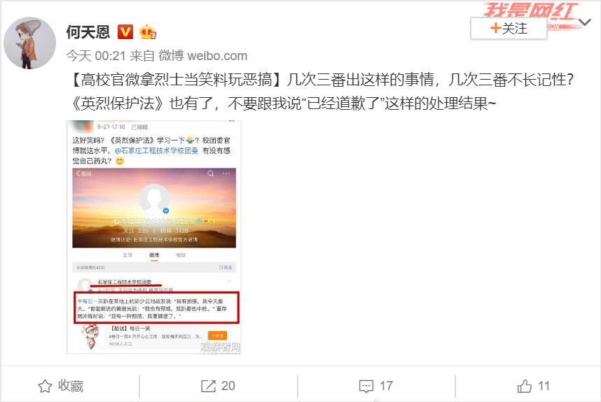 自媒体大V@何天恩 也无法抑制情感:“几次三番出这样的事情,几次三番不长记性?《英烈保护法》也有了,不要跟我说‘已经道歉了’这样的处理结果~”。