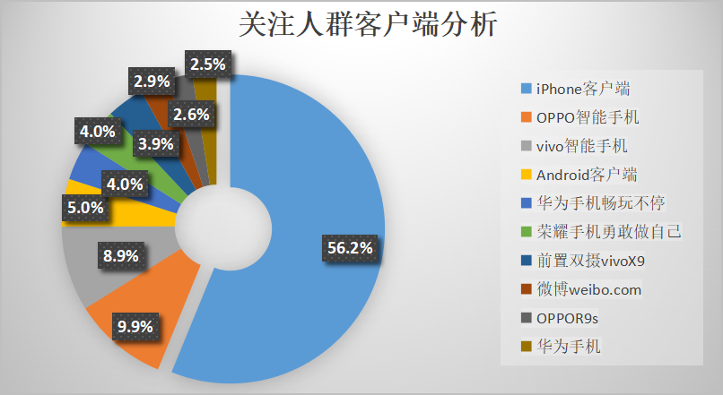由下面的关注人群客户端分析图可以看出,来自“iPhone客户端”的言论最多,占比高达56.2%,“OPPO智能手机”“vivo智能手机”紧随其后,纵观各种移动传播终端可见,目前较少网民习惯使用电脑设备参与传播该事件并发表观点,另外,移动客户端的排名顺序也与各种移动设备的市场占有率有关。