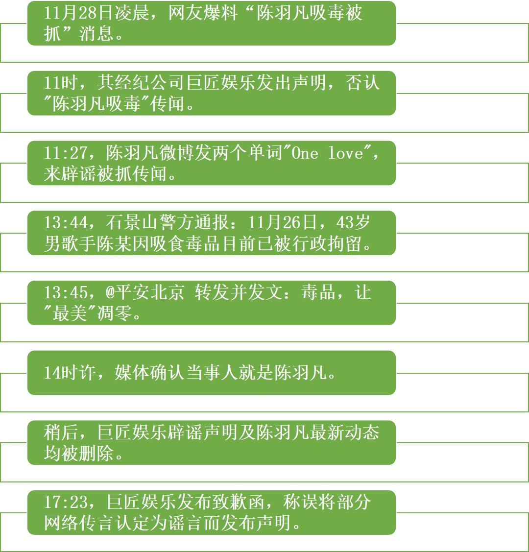 蚁坊软件舆情监测系统(鹰击早发现)显示,11月28日1时起,网传“疑似#陈羽凡吸毒#被抓”引发网络关注;11时左右,陈羽凡经纪公司及个人微博账号均发表声明辟谣,引发网友讨论,相关热度升温;13时许,当地警方及权威媒体通报确认“歌手陈羽凡吸毒被抓”,网络舆情直线上升,并于当日的14时-15时达到峰值;当日傍晚媒体@中国经济网 @新京报我们视频 等相继报道“#歌手陈羽凡吸毒# 被行政拘留 背后经纪公司巨匠文化顺利挂牌新三板成疑”“探访陈羽凡被带走地点”等信息及“胡海泉再次发声”促使事件舆论热度再次反弹,于8时-9时到达次高峰。
