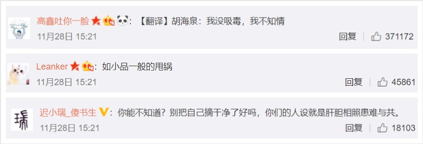 不过一些网友质疑胡海泉这是在撇开关系“我没吸毒,我不知情”,还有一些网友认为“你能不知道?别把自己摘干净了好吗,你们的人设就是肝胆相照患难与共。”
