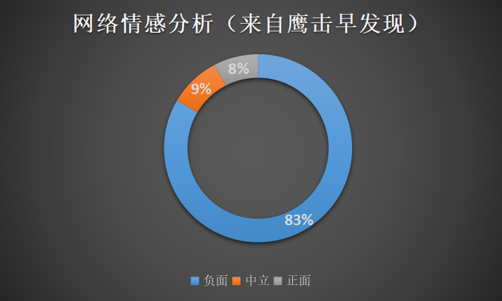 鹰击早发现显示,整个网络情绪以负面为主,占比83%,不少网友除了表达对公众人物“吸毒”行为的反感、对经纪公司巨匠娱乐包庇艺人行为的痛斥之外,也有对胡海泉“甩锅”的质疑......正面情绪占比8%,主要是对缉毒队及“朝阳群众”的点赞及部分网友表达的“心疼海泉”。