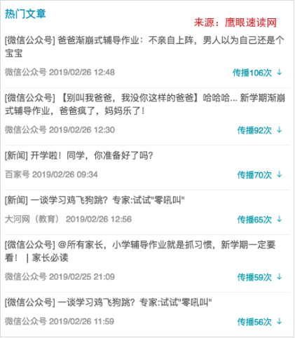 从鹰眼速读网的分析来看,微信公众号的传播占据了主导地位,《爸爸渐崩式辅导作业:不亲自上阵,男人以为自己还是个宝宝》传播达到106次,看来在继妈妈们崩溃之后,爸爸们也加入了阵营。