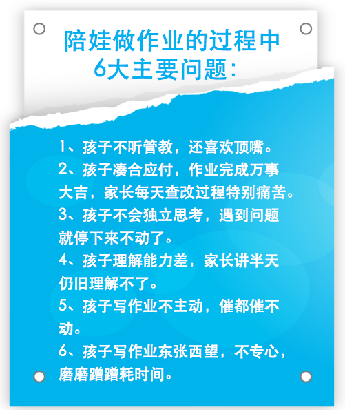 其实,只要了解了陪孩子做作业时碰到的问题就可以有针对性的解决,那么主要有哪些问题呢?