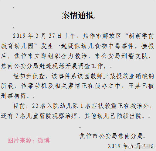 河南焦作一名幼师为了报复另一名老师,向幼儿园孩子午餐里投入亚硝酸盐,导致23名小朋友中毒。目前,中毒入院幼儿除1名症状较重正在救治外,还有7名儿童留院观察治疗,其他幼儿已陆续出院,投毒幼师已被警方刑拘。随后,该事件在网络持续发酵,幼师投毒相关话题引发网友热议。