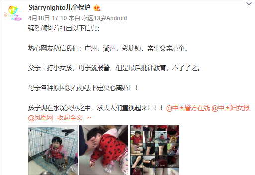 4月18日17时10分,微博博主@Starrynighto儿童保护 发布了一则关于“亲生父亲虐童”的消息,一短发女孩或被关在狗笼里或被绳拴住或躺在地上被人用脚踩脸部甚至多出淤青,几张图片触目惊心。经由@中国妇女报 @搜狐新闻 @广州日报 等转发后,随即引发舆论震动,网民强烈声讨虐童行为,呼吁警方介入。