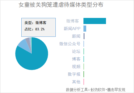女童被关狗笼遭虐待网络热度趋势变化如上图所示,自18日舆情曝光至20日12时数据统计截止,共出现两次声量高峰。在所有媒体类型分布中,以微博为主阵地的社交平台带动了话题讨论热度,遥遥领先于其他传播渠道。