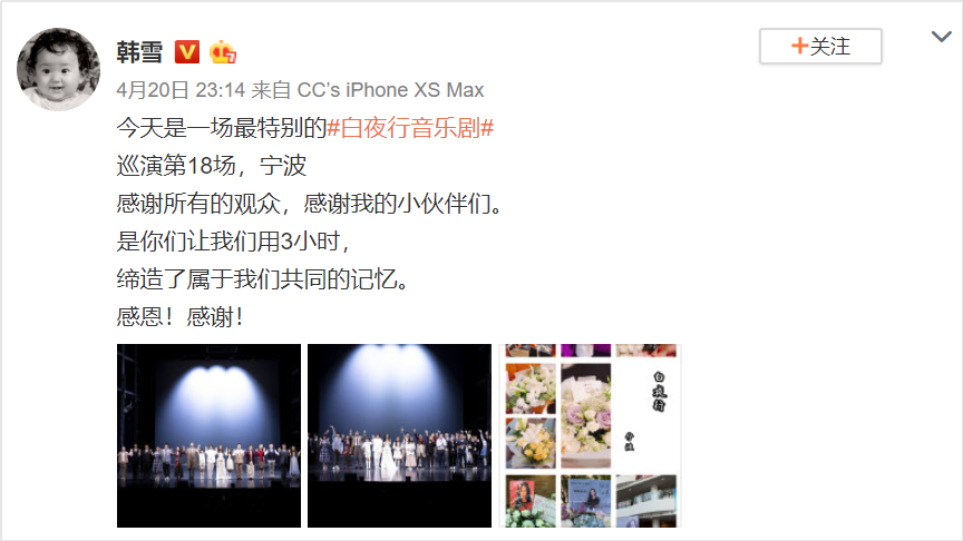 该文指出,4月20日晚,音乐剧《白夜行》在宁波站巡演,临开场前,女主演韩雪宣布因突发急性声带炎,使用录音代替演唱。