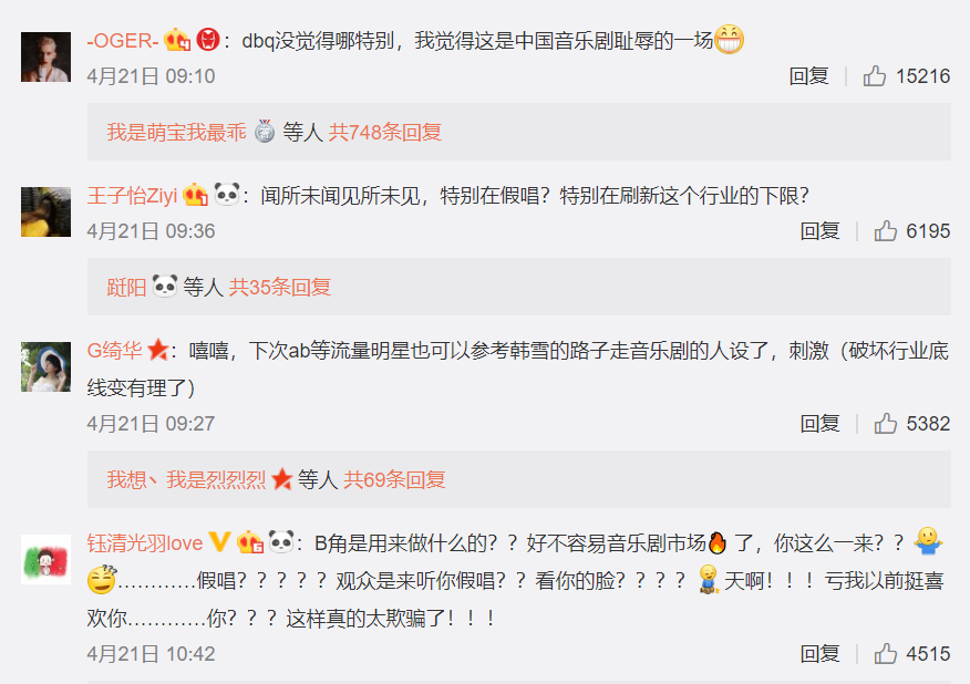 韩雪带病演出,虽然引发了部分观众及粉丝的同情及感动,但做出音乐剧现场放录音的选择和行为是不能容忍的职业底线,引来了更多的舆论批评。其博文下方聚集了不少情绪亢奋的言论,“这是中国音乐剧耻辱的一场”“闻所未闻见所未见,特别在假唱?特别在刷新这个行业的下限?”......也有人直接点名:当韩雪同意放录音的那一刻,她就等于放弃了艺德。一时间让韩雪原来近乎完美的人设备受影响。