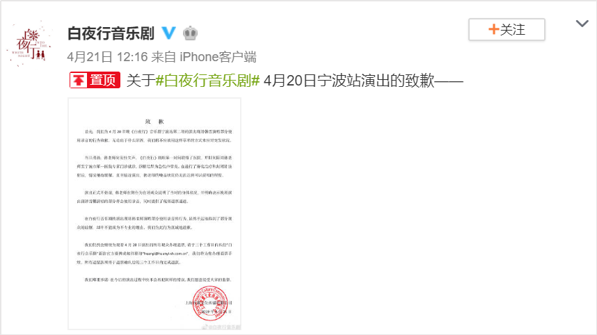 随着事件的不断发酵,21日12:16,主办方@白夜行音乐剧 正式发文道歉,表示当时实属特殊情况,韩雪被诊断为“急性声带炎”,才选择放录音,也会妥善处理好退票事宜,并承诺之后的演出不会再犯同样的错误。